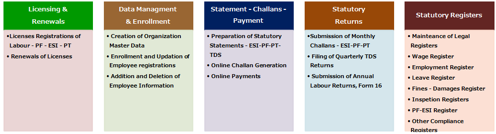 The Statutory Compliance Management involves Various licenses registrations, Renewals, Regular and periodical payments, submission of returns, Maintenance of Registers, Records, Attending the inspections and develops a Compliance Report.